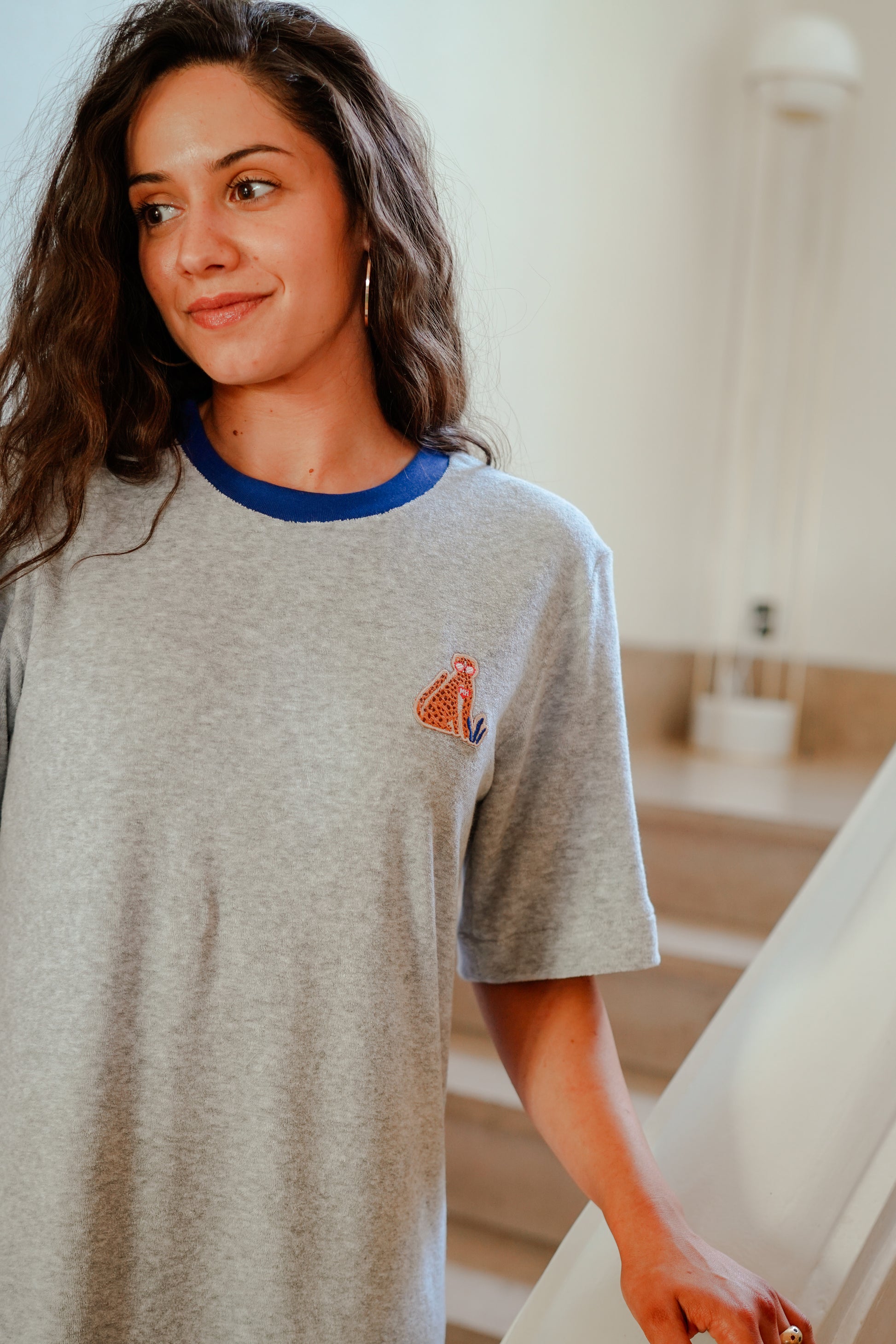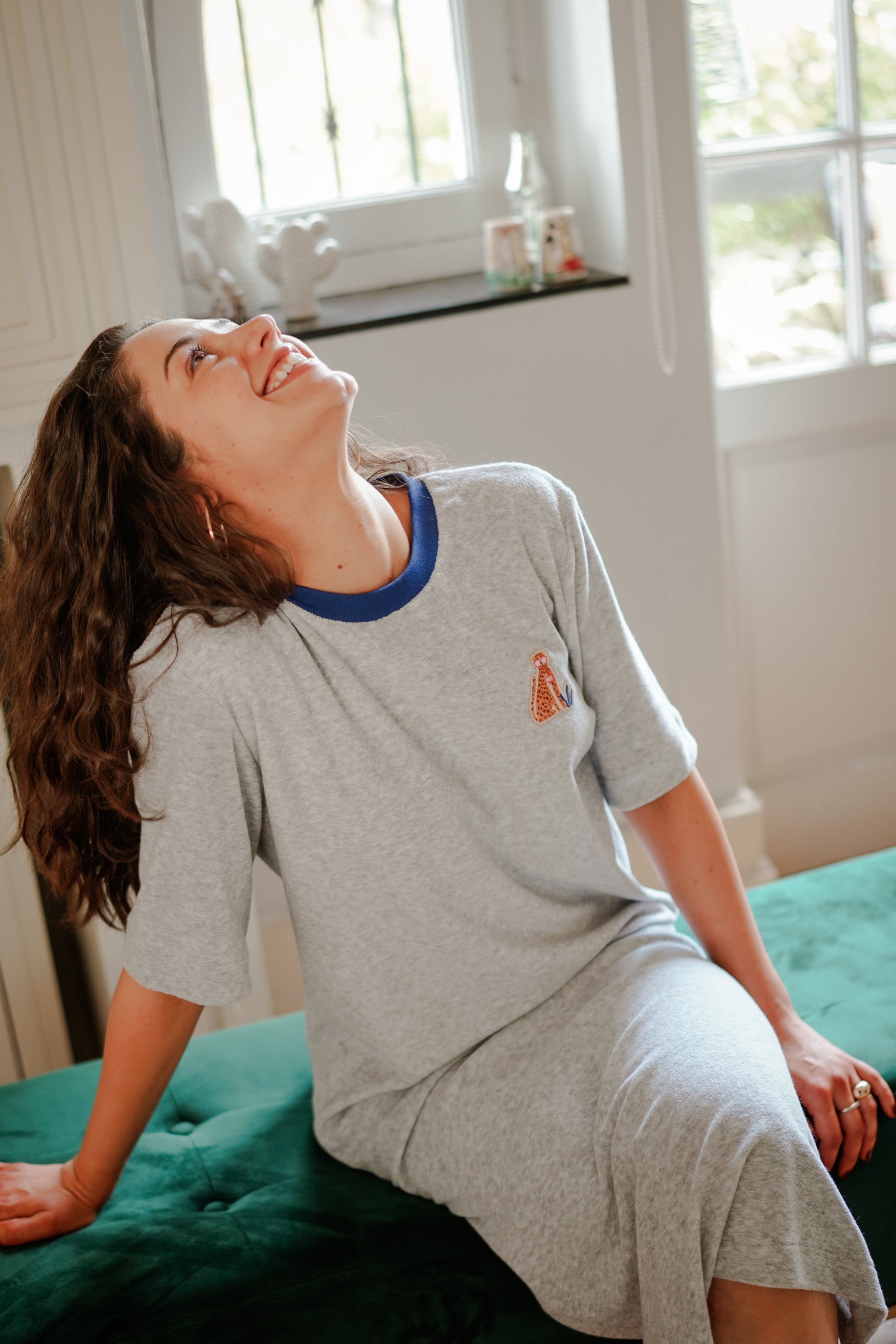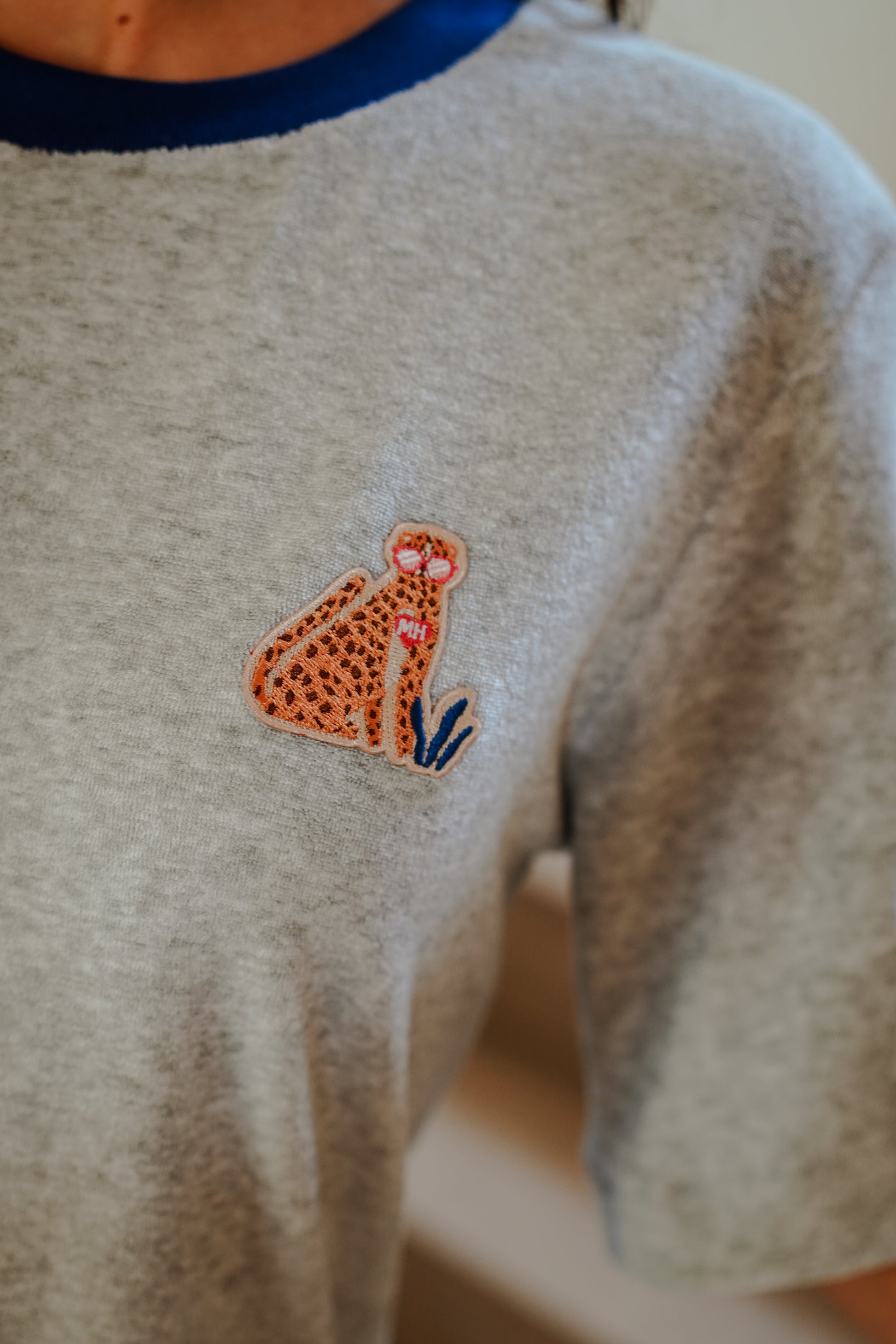 La robe GINA en éponge douce est votre allié idéal toute l’année. Confortable, stylé, et facile à porter, elle se distingue par son encolure contrastée bleu vif et sa broderie exclusive "léopard MH", signature de Madame Henriette.