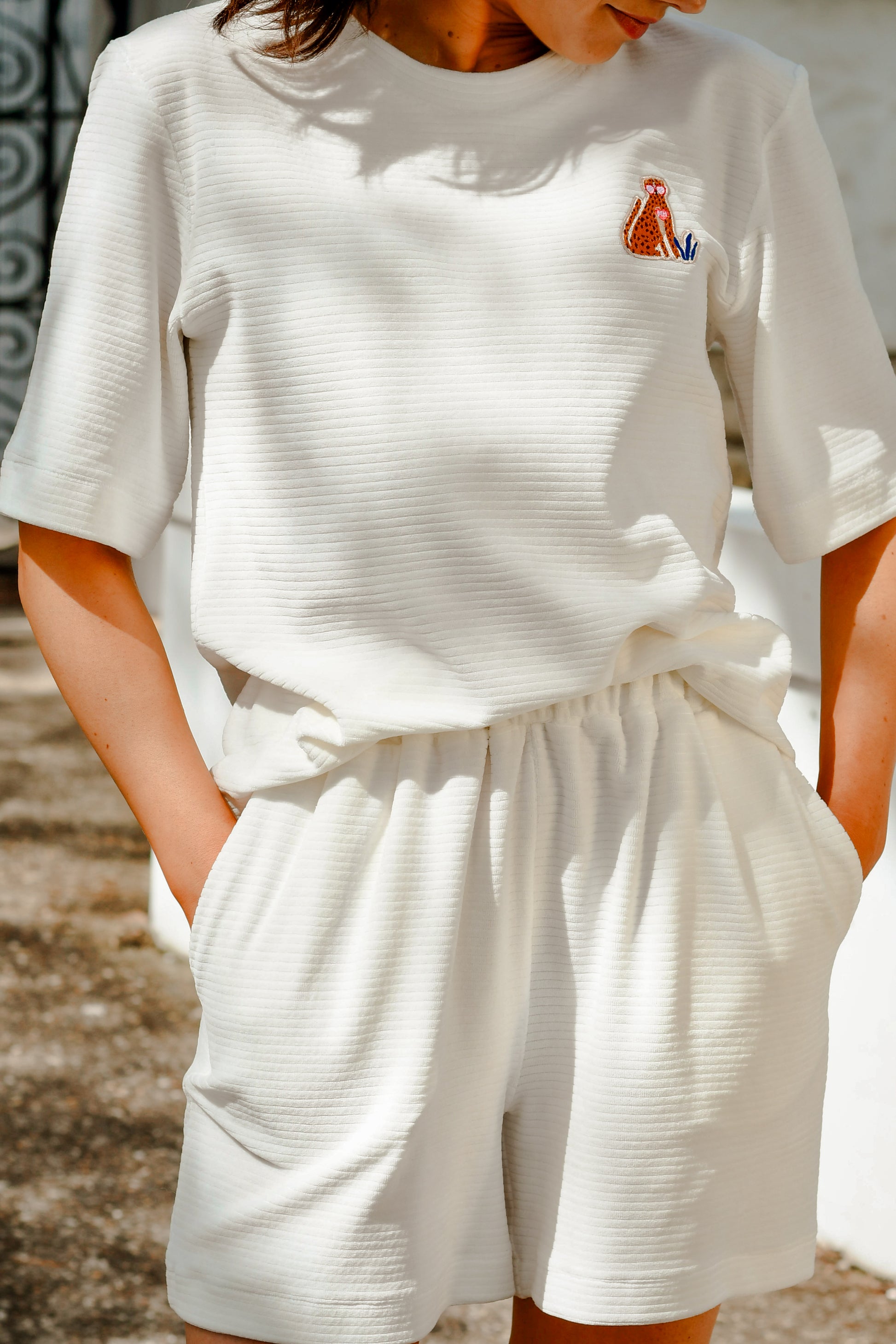 Confectionné dans une éponge velours striée, il offre un tombé souple et un confort absolu. On aime son toucher moelleux, son esprit rétro revisité… et surtout sa broderie exclusive timbre rose ou léopard au choix sur la poitrine, délicate et subtilement décalée.